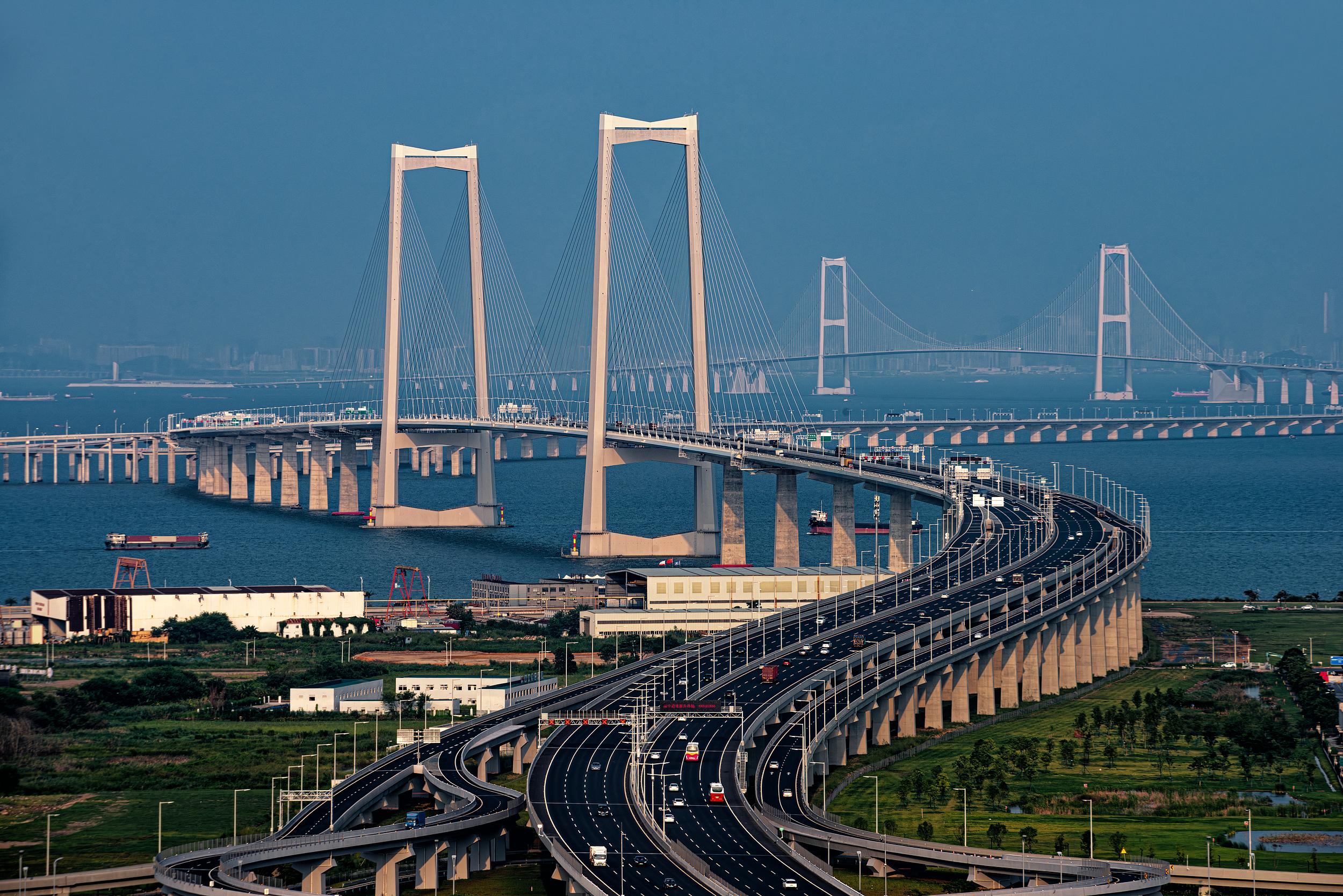 The ShenZhong Bridge contains two 270-meter-high main towers with a navigation clearance of 76.5 meters, the highest in the world, according to Zeng Wei, executive deputy chief engineer of the ShenZhong Link project. Zeng said it was a big challenge to build the main tower safely and efficiently in a complex marine environment with frequent typhoons.