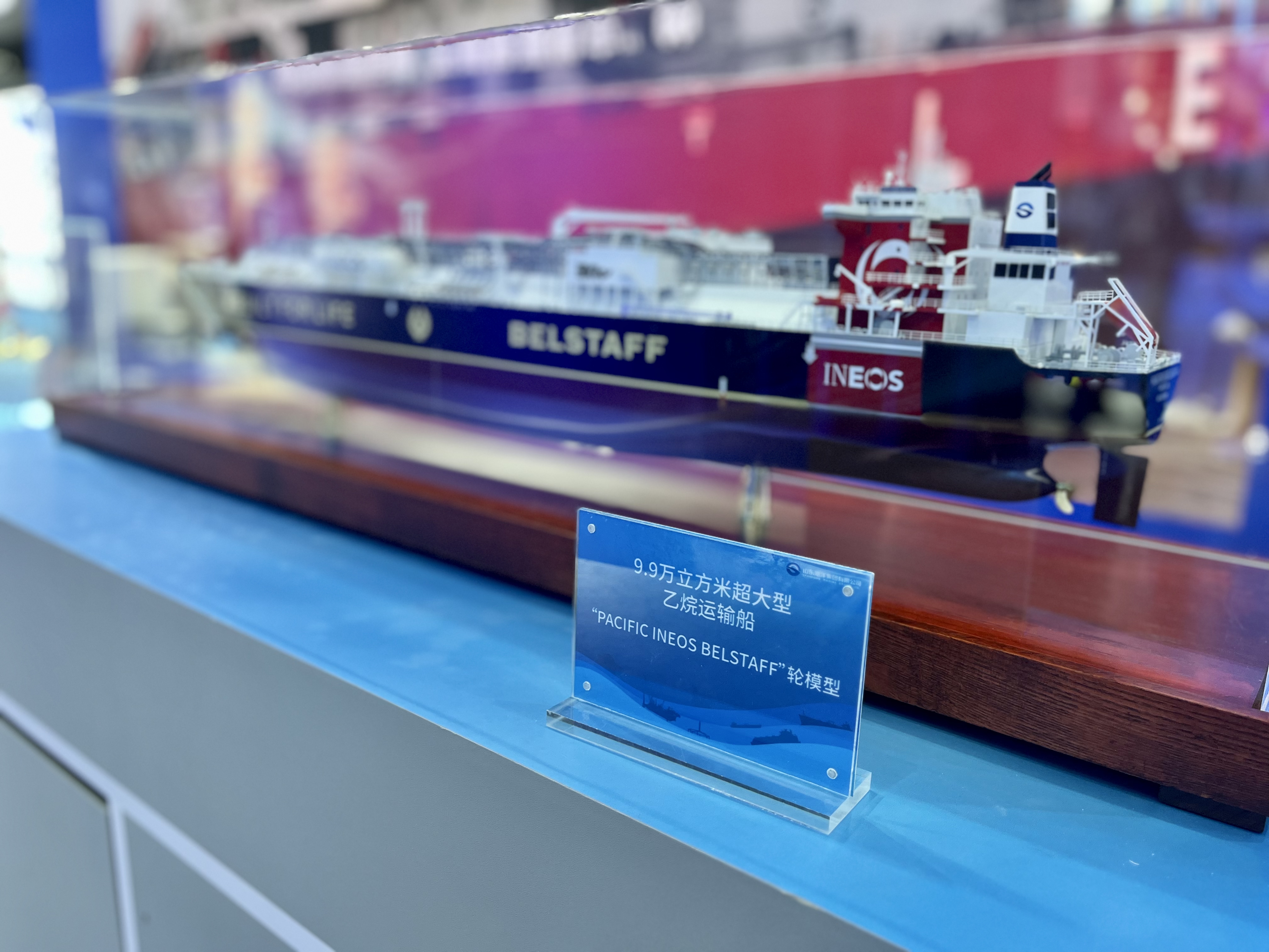 展出现场,山东海洋集团展区的9.9万立方米超大型乙烷运输船“PACIFIC INEOS BELSTAFF”轮模型引发众多观众驻足参观。