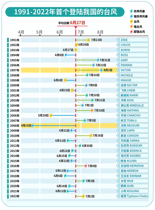 1991-2022年首个登陆我国的台风名称、登陆日期及登陆时强度。丁茜制图