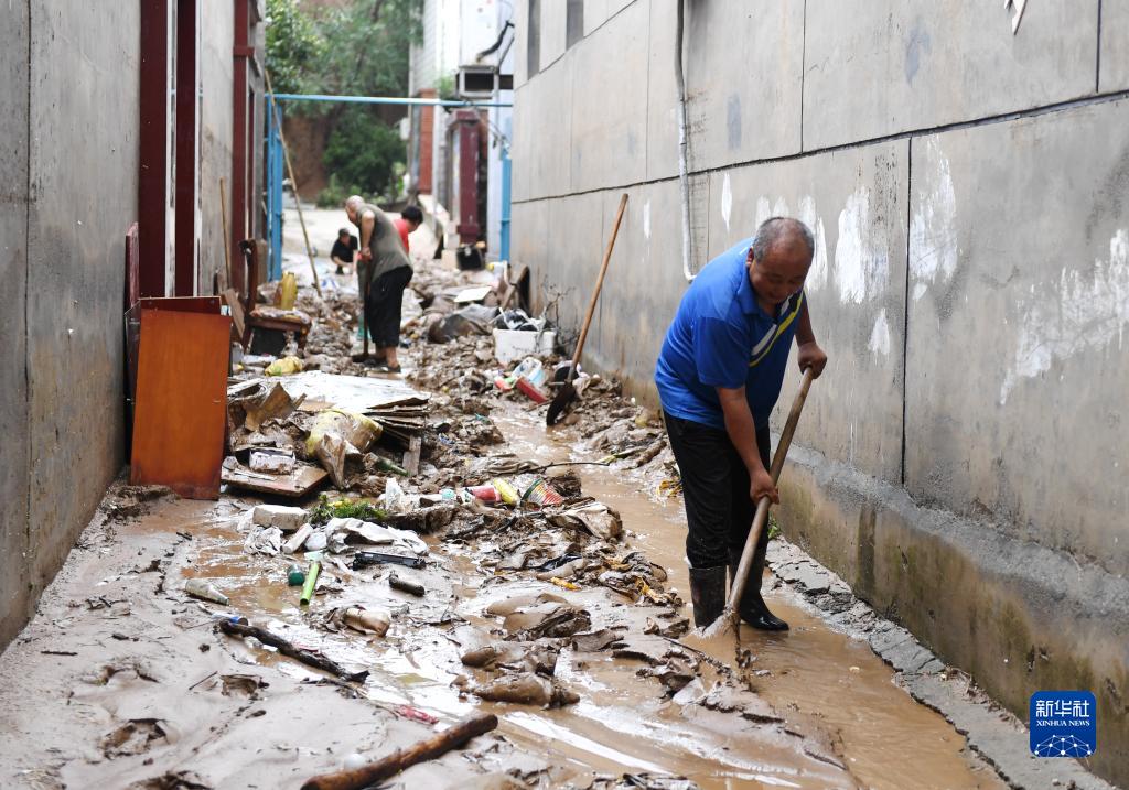 8月1日,在北京市房山区青龙湖镇上万村,村民清理山洪过后堆积的淤泥。
