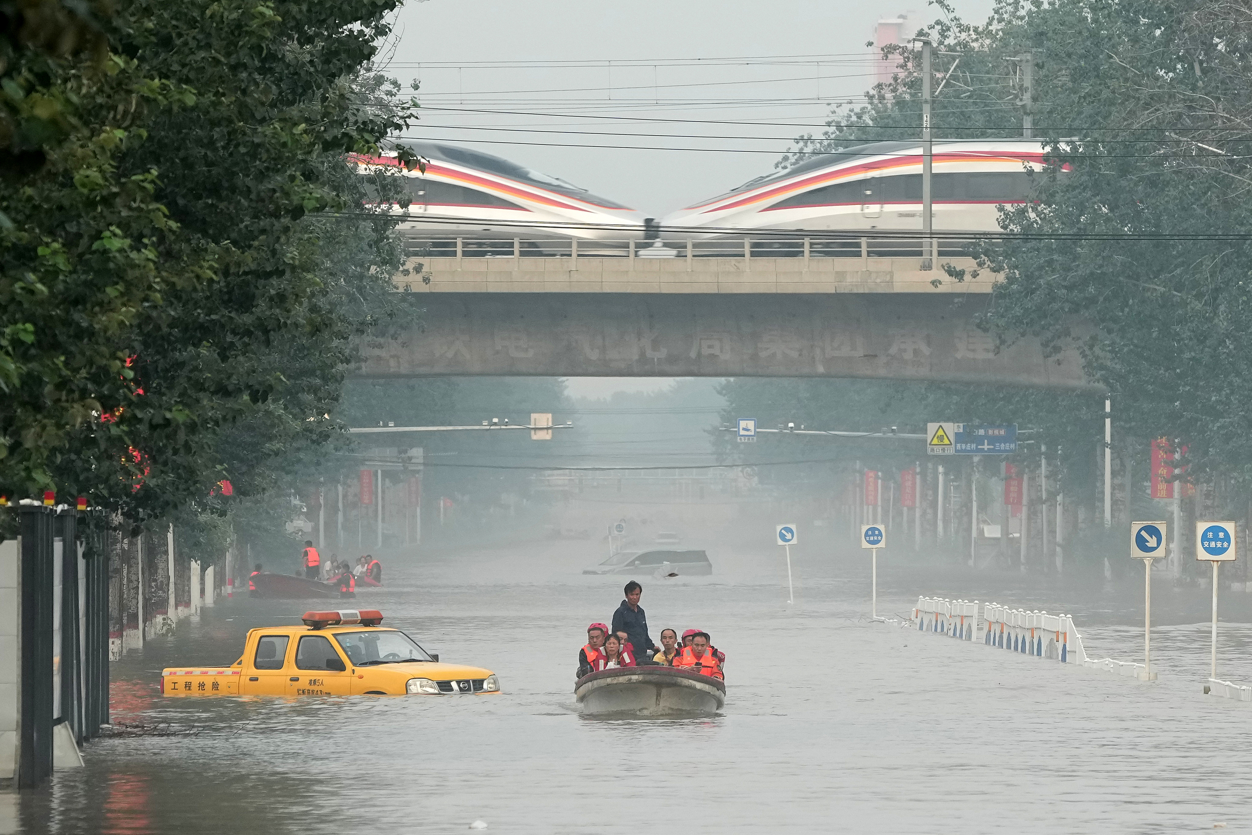 2023年8月2日,民众乘坐船只转移。当日,多支消防救援力量在河北省涿州市码头镇救援转移受灾民众。中新社记者 崔楠 摄 视觉中国供图