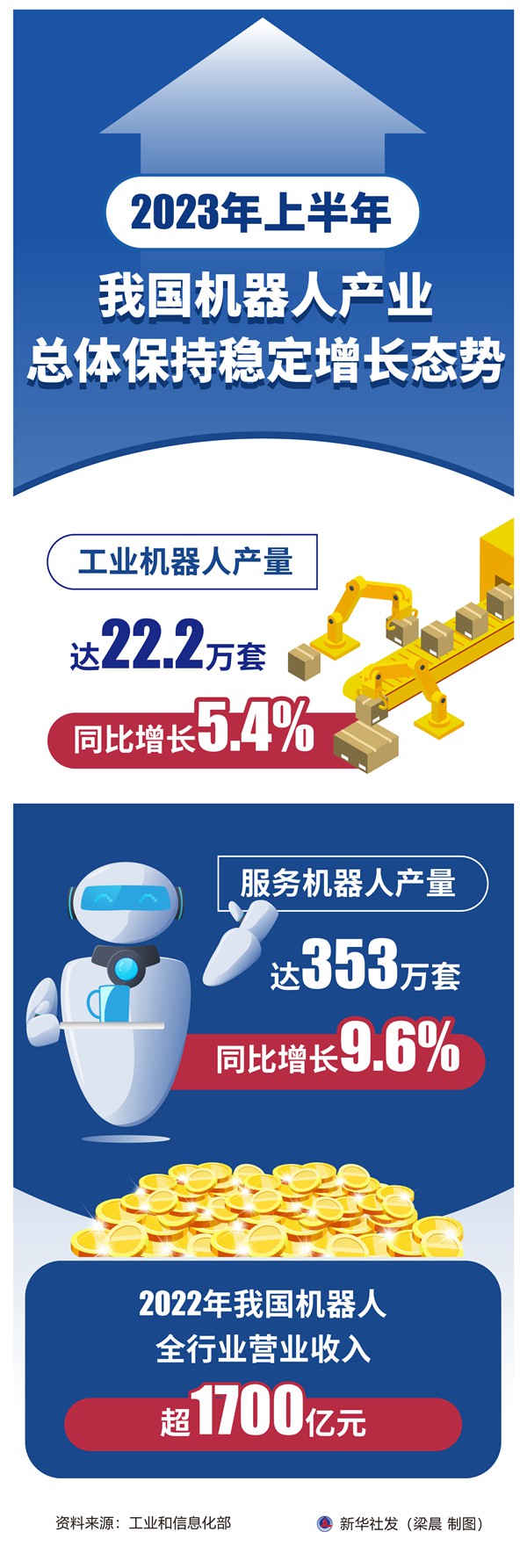 工业和信息化部装备工业一司副司长汪宏日前在2023世界机器人大会新闻发布会上说,今年上半年,我国机器人产业总体保持稳定增长态势,工业机器人产量达22.2万套,同比增长5.4%,服务机器人产量达353万套,同比增长9.6%。