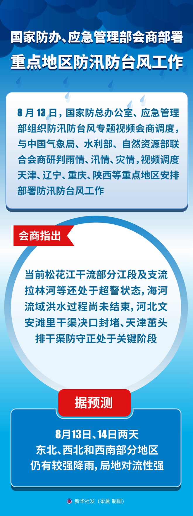会商指出,当前松花江干流部分江段及支流拉林河等还处于超警状态,海河流域洪水过程尚未结束,河北文安滩里干渠决口封堵、天津茁头排干渠防守正处于关键阶段。据预测,今明两天东北、西北和西南部分地区仍有较强降雨,局地对流性强。