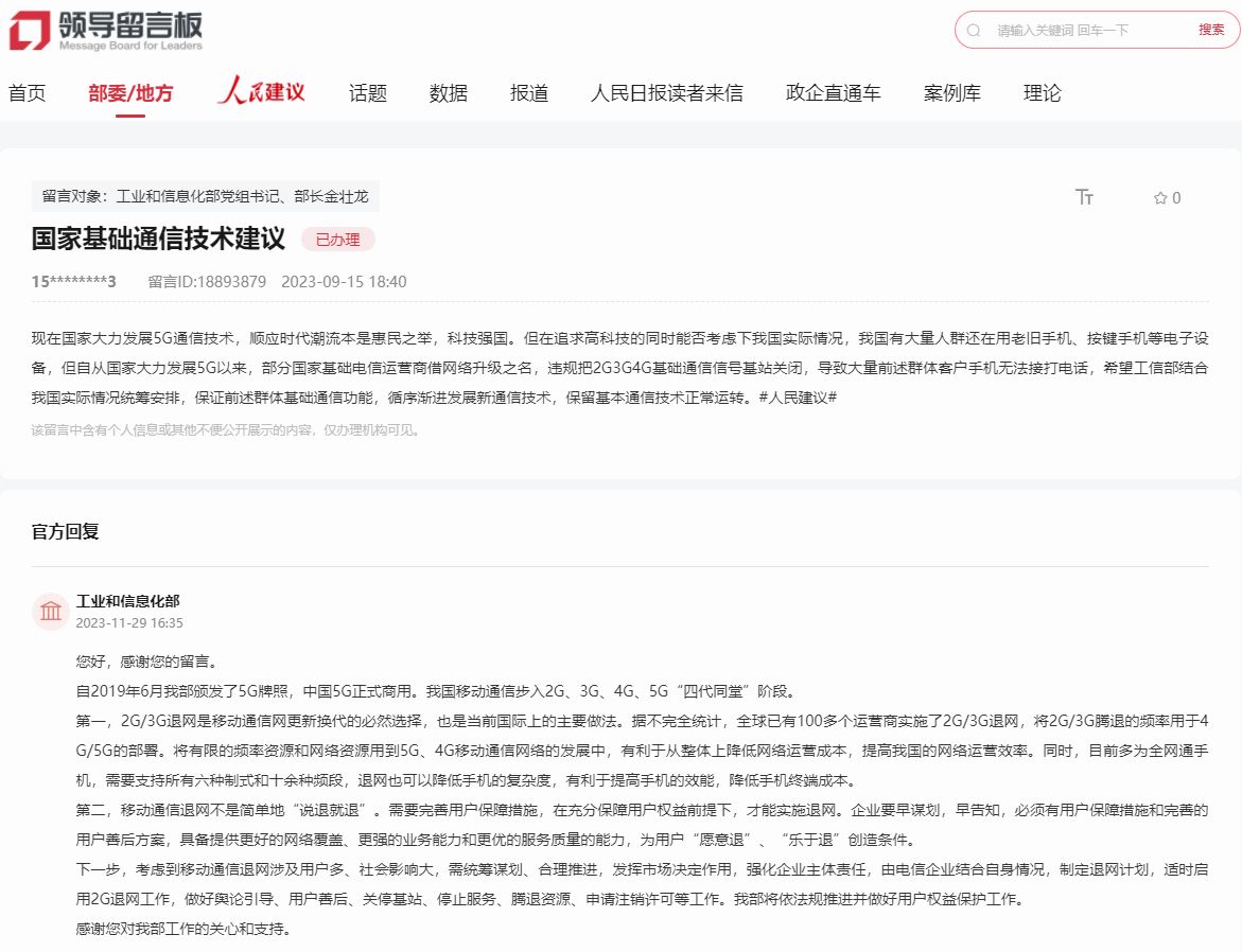 针对社会关注的“2G、3G退网”问题,工业和信息化部相关负责人表示,2G、3G退网是移动通信网更新换代的必然选择,但同时也要完善用户保障措施,在充分保障用户权益前提下,才能实施退网。工业和信息化部将统筹谋划、合理推进,同时要求移动通信企业早谋划早告知,为用户“愿意退”“乐于退”创造条件。