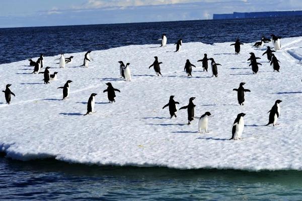 在罗斯海海冰上栖息的阿德利企鹅。新华社记者 张建松 摄