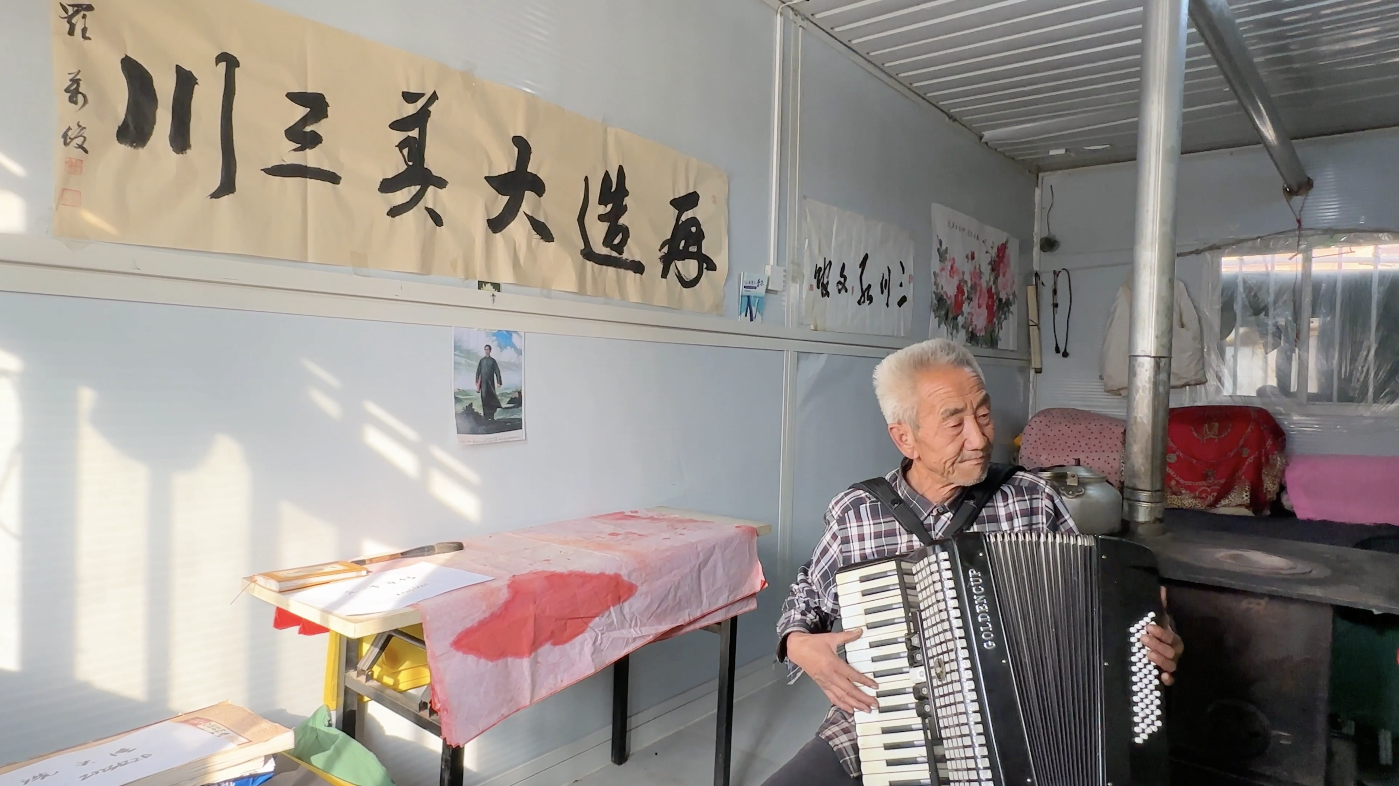 在喇家村村民李成栋家的安置板房内,火炉上的大茶壶不停喷出熬茶香味,67岁的村民李成栋坐在炉子旁深情地拉着手风琴,一首《我的中国心》音符不断跳出板房外。而在板房外,国网海东供电公司志愿者正在给村民书写春联,红纸上笔酣墨浓,一副副饱含祝福的春联贴到了板房上,官亭供电所台区经理鲍呈润和几位同事正在为大红灯笼通电。