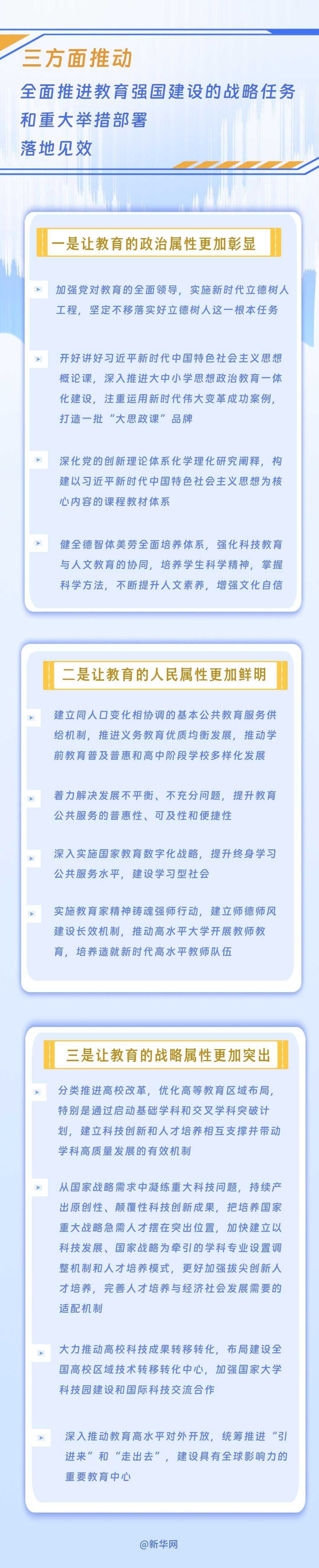 怀进鹏介绍,将重点从让教育的政治属性更加彰显、让教育的人民属性更加鲜明、让教育的战略属性更加突出三个方面推进。