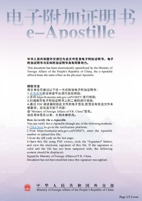 自试点之日起,申请人在中国贸促会申办原产地证书,可同步申办电子附加证明书,实现“一站式、零跑腿”办理。我国签发的电子附加证明书与实体附加证明书具有同等效力。电子附加证明书可通过外交部“领事认证/附加证明书在线核查系统”(https://consular.mfa.gov.cn/VERIFY)在线核验。
