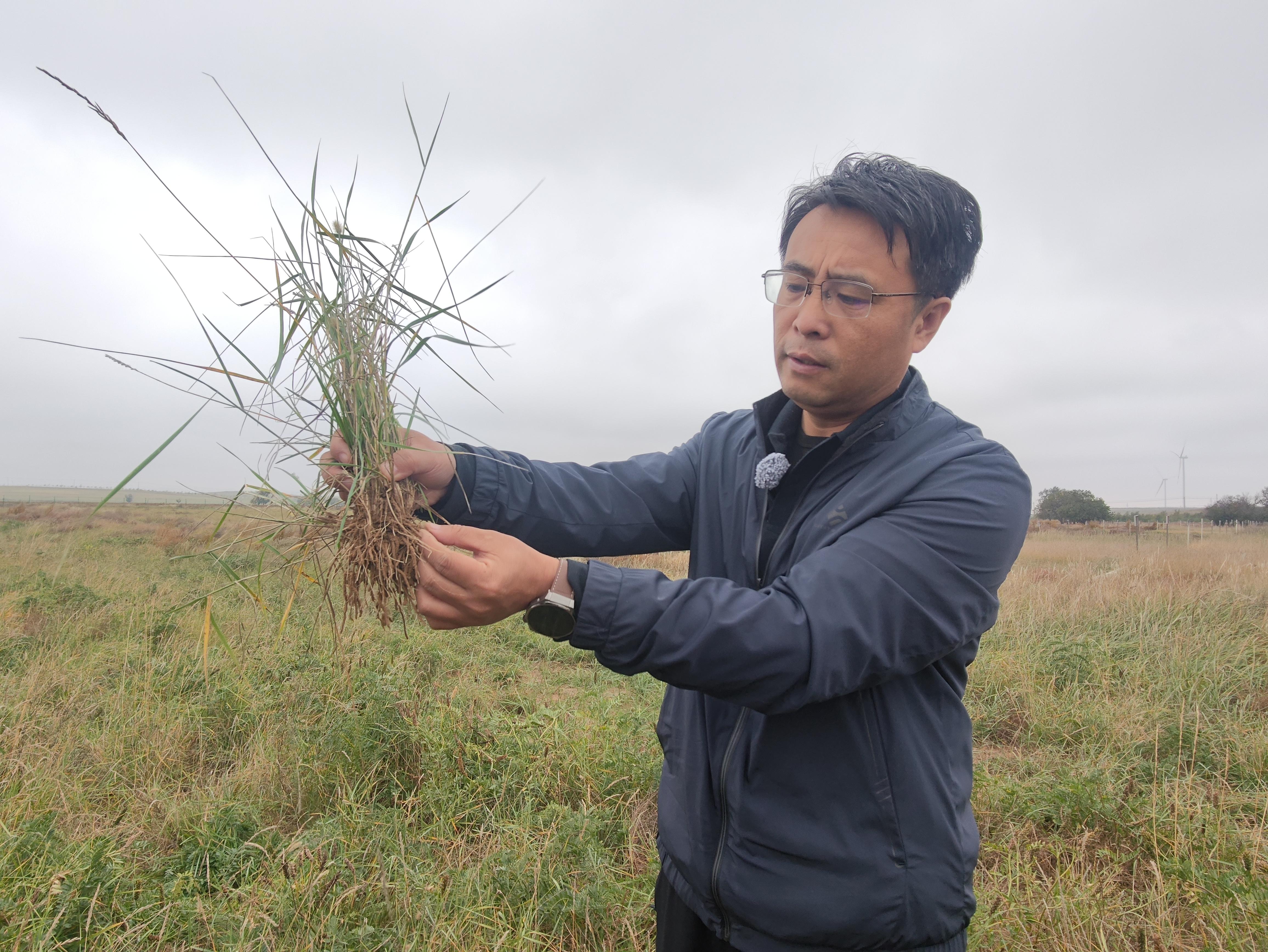 谁能想到,这片郁郁葱葱的土地,此前还是寸草不生的荒滩。去年,王占军团队针对这片退化草原开展补播改良试验,精选当地抗旱优良乡土牧草进行组合播种。