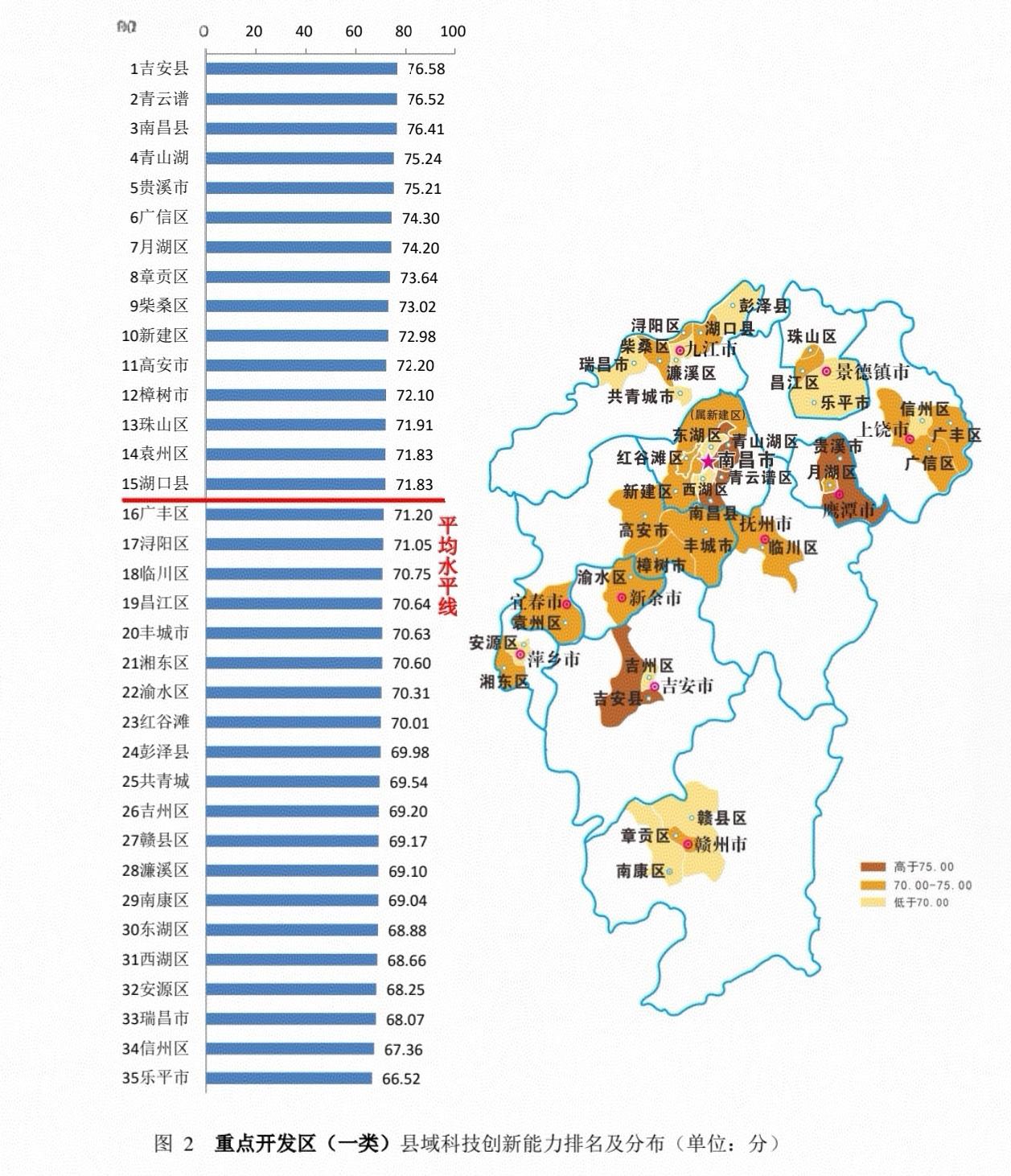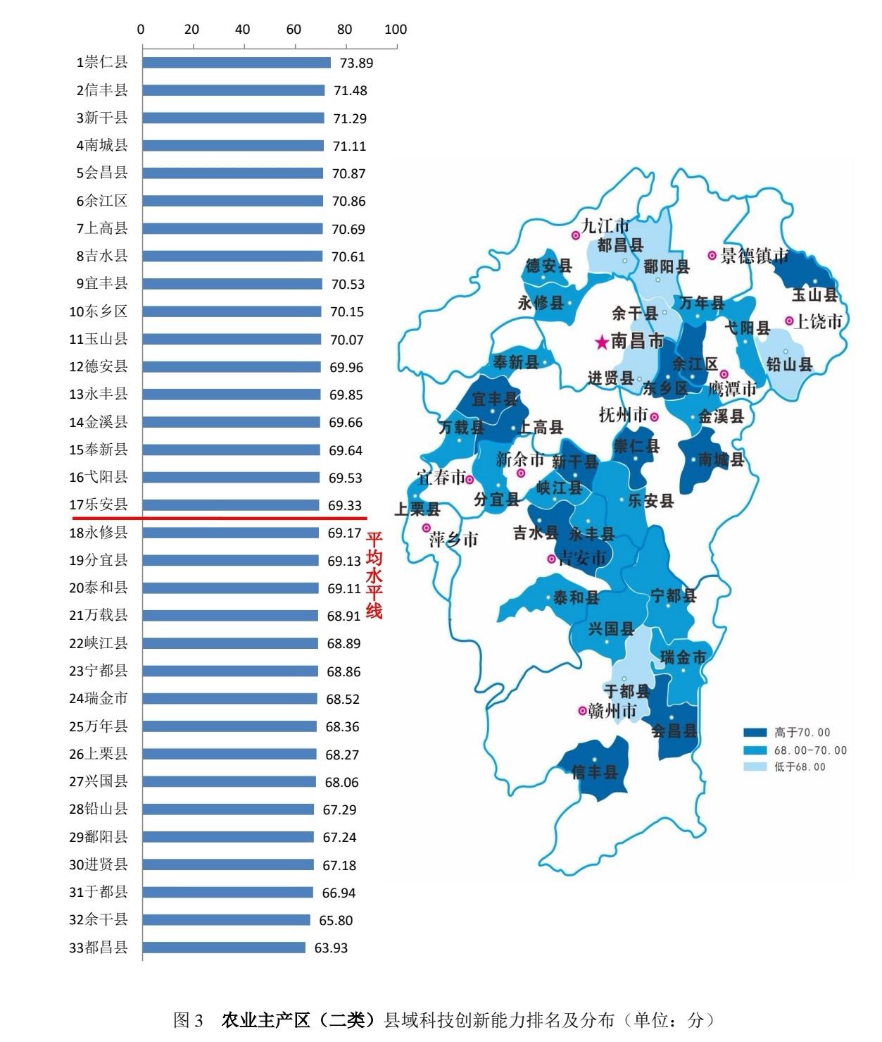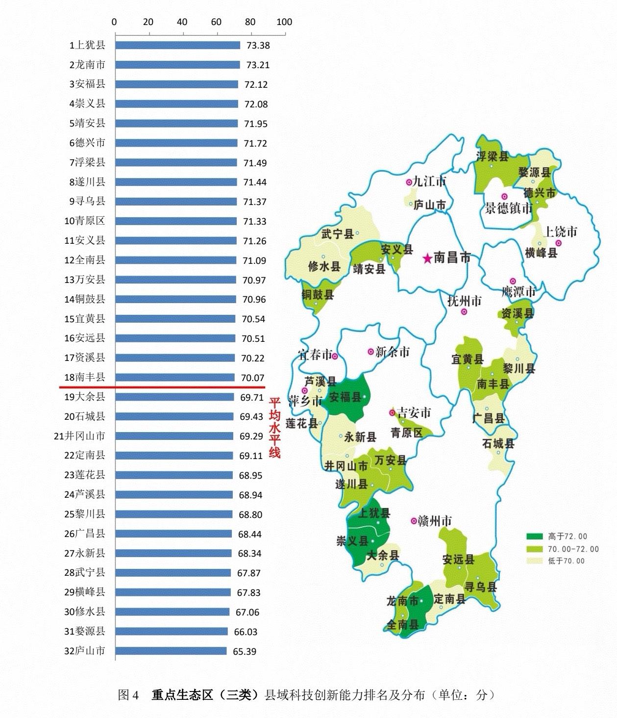 依据江西省主体功能区规划及各县区产业发展等情况,《报告》对全省县(市、区)按重点开发区(35个)、农业主产区(33个)、重点生态区(32个)进行分类比较分析。重点开发区平均得分为71.34,农业主产区平均得分为69.25,重点生态区平均得分为70.03。吉安市吉安县、抚州市崇仁县、赣州市上犹县分别位列各类区域第一。