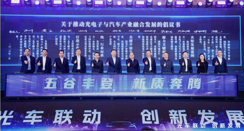 现场,东湖高新区、武汉经开区、江夏区与整车及零部件、光电子、芯片、智能制造等领域企业代表、车百会代表共同签署“光车融合倡议书”,围绕发展路径规划、关键技术攻关、产业生态共建、标准体系协同与应用示范推广等方面,共绘行动路线。