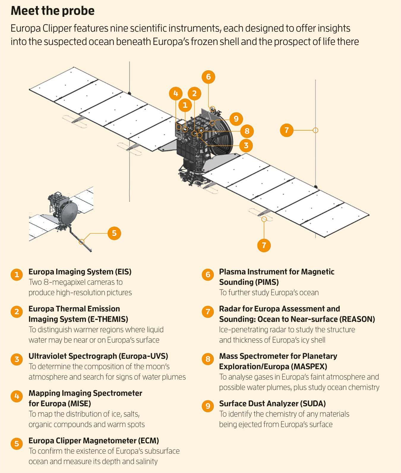 为完成使命,“欧罗巴快船”携带了摄像机、光谱仪、热成像仪、冰穿透雷达、磁力计等传感器,尽力收集有关这颗星球内外部的一切。