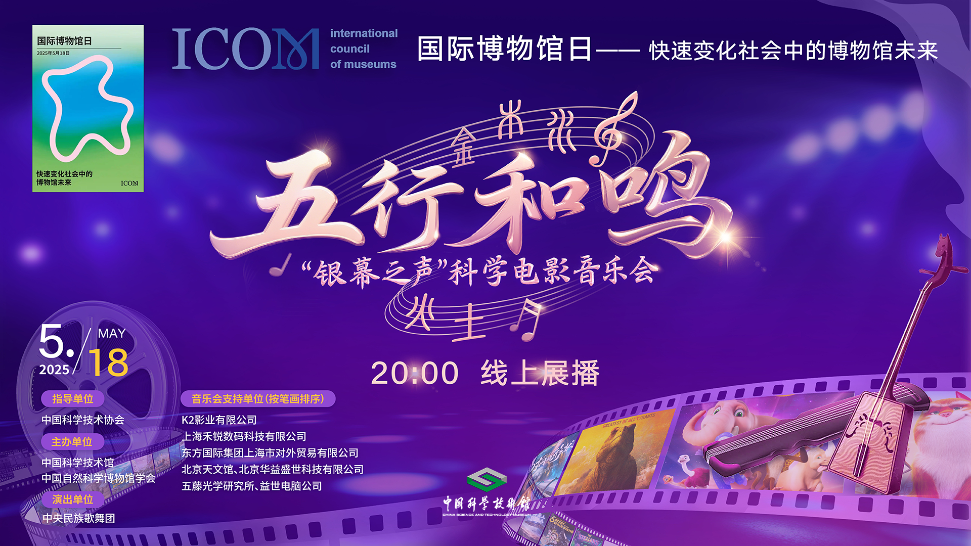 作为博物馆特效影院活动形式的全新探索,《五行和鸣》“银幕之声”科学电影音乐会让特效电影与民族音乐,世界名曲与非遗乐器打破时空界限,碰撞出绚烂的花火!在5·18国际博物馆日,这场“破圈”的科学艺术盛宴将以线上展播形式惊艳亮相,带你解锁快速变化的社会中,科技博物馆的无限未来。