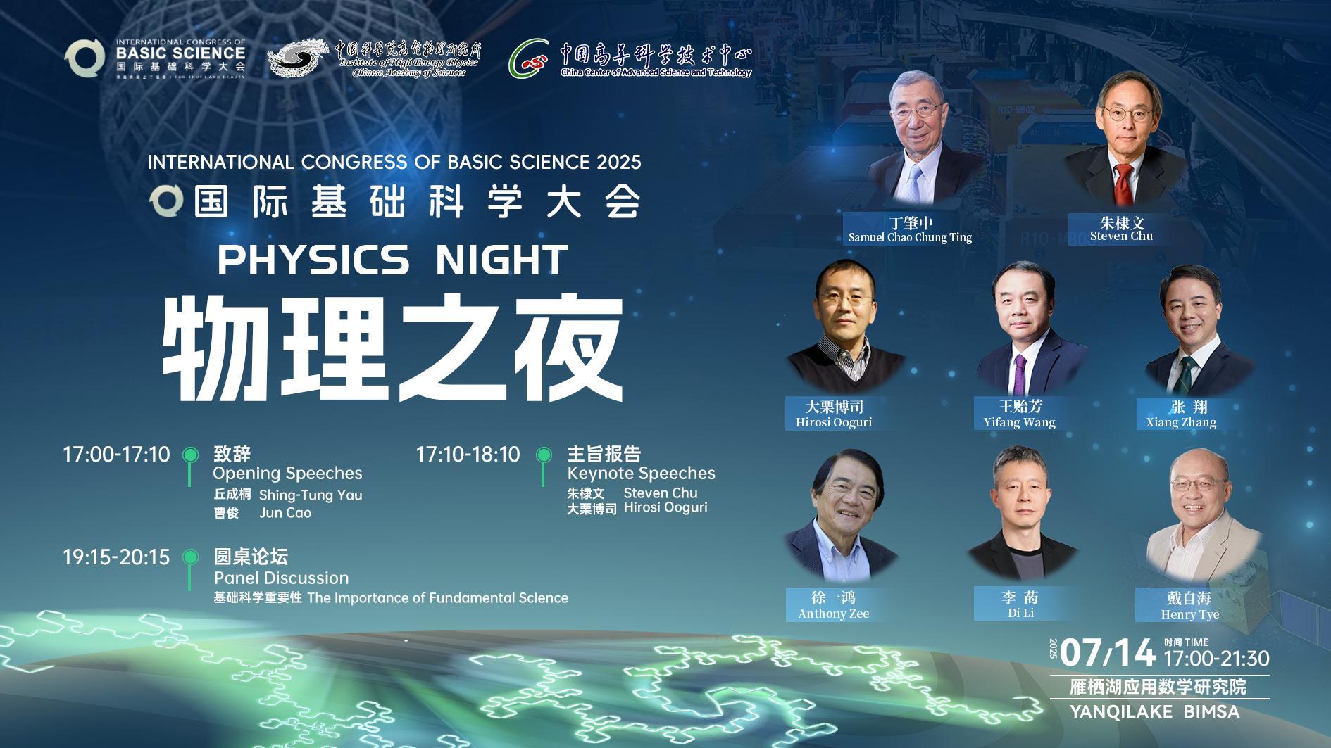 由中国科学院高能物理研究所、中国高等科学技术中心承办的“第三届国际基础科学大会—物理之夜”将在北京雁栖湖应用数学研究院举办。本届物理之夜将有三位获得基础物理学终身成就奖、诺奖得主丁肇中、David Gross和朱棣文三位教授参加主旨报告和圆桌论坛,同时参加活动的还有丘成桐、王贻芳、Hiroshi Ooguri/大栗博司,张翔、徐一鸿、戴自海、李菂等顶尖科学家。7月14日17:00,敬请关注!