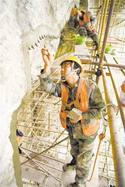 3月16日,在龙门石窟奉先寺危岩体加固和渗漏水治理工程现场,工作人员正在奉先寺崖壁上制作和安装微型滴水檐。 视觉中国供图