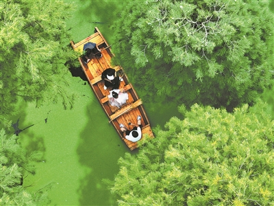 游客在江苏省扬州市江都区渌洋湖湿地公园的水上森林乘船游览。新华社发(孟德龙摄)