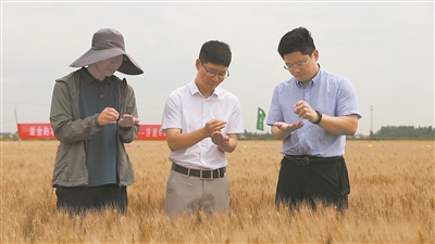 山东省农科院作物所小麦育种专家在东营垦利进行抗旱耐盐碱小麦济麦60测产验收。受访者供图