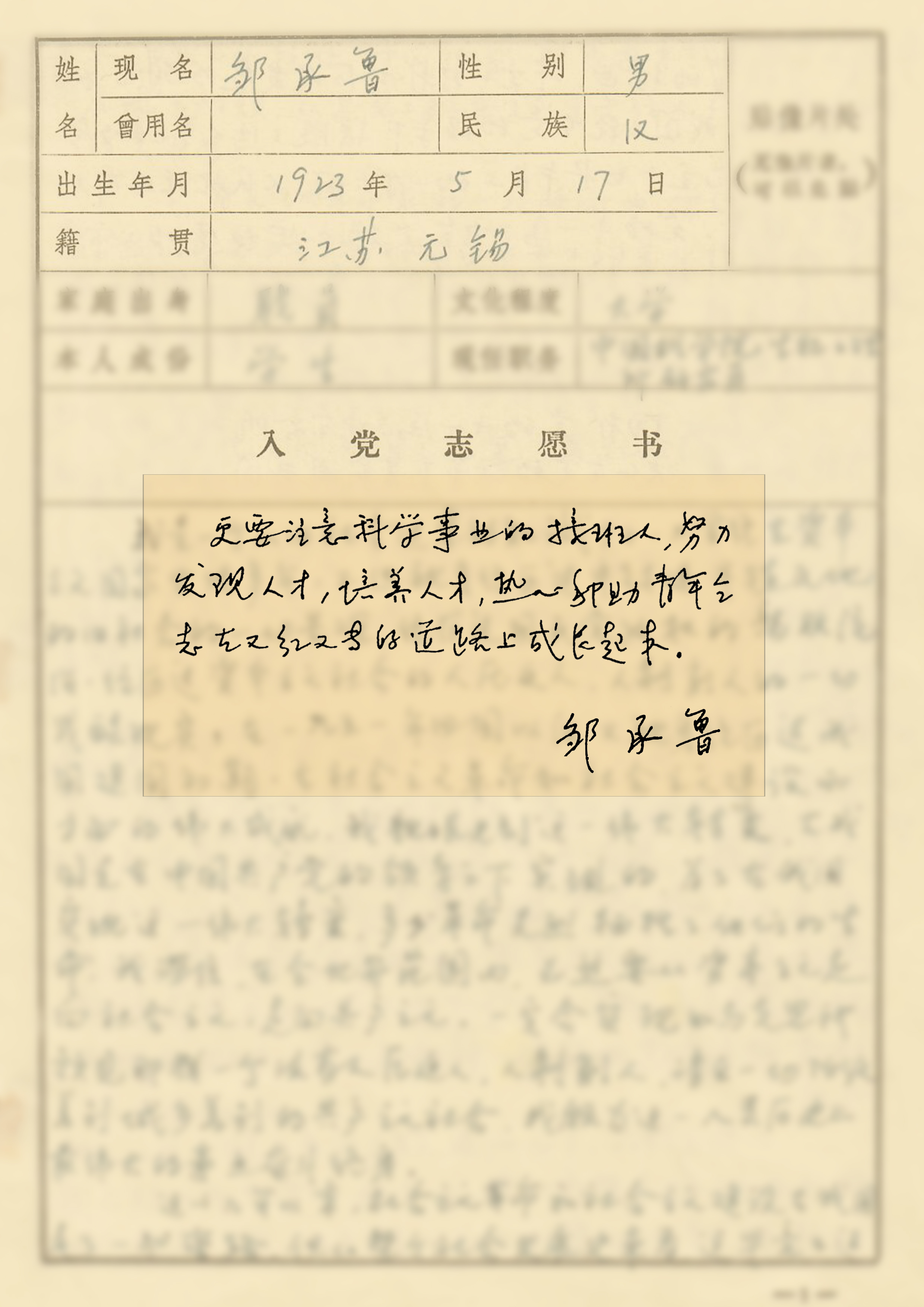 ——摘自邹承鲁1981年8月《入党志愿书》